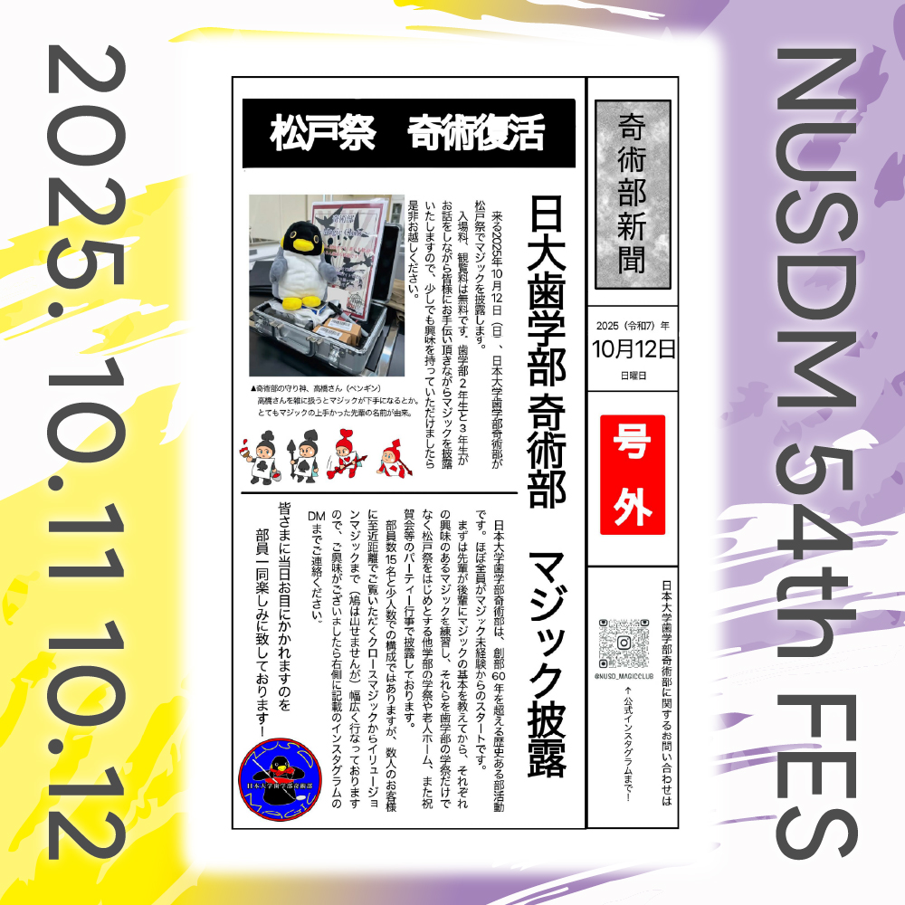 日本大学 松戸歯学部4年 第54回松戸祭実行委員長の袴田杜です。松戸祭は、昨年の新校舎の開設を機に、その装いを一新させました。 今年度もその勢いそのままに、さらに規模を拡大し、パワーアップさせた松戸祭を作り上げていきます。 新しい環境のもと、学生一人ひとりが自由に工夫を凝らし、地域の皆さまと交流を深められる場として、これまで以上に活気あふれる祭りを目指しております。 本年度のスローガンは「躍動」です。この言葉には、学生・地域の皆さま・教職員が一体となり、心を震わせるような感動を共有したいという思いを込めました。 松戸祭を通じて、来場された皆さまの心に新たな活力や温かなつながりを生み出すことができれば幸いです。 企画につきましては、商工会のご協力により多彩なキッチンカーをお招きするとともに、消防・自衛隊とのコラボイベントを開催いたします。 また、毎年ご好評いただいているダンス部によるステージライブや、各部活動による模擬店も昨年に引き続き実施いたします。 小さなお子さまから大人の方まで幅広く楽しめる催しを数多くご用意しておりますので、ご家族やご友人とお誘い合わせのうえ、思い思いの時間を過ごしていただければと思います。 松戸祭は単なる学園祭ではなく、私たち学生が日々の学びを地域に還元し、交流を深める大切な機会でもあります。笑顔や感動を共有する中で、大学と地域とが共に「躍動」し合える場となることを願っております。 最後になりますが、松戸祭の開催にあたり、多大なるご支援をいただいた商工会、自衛隊、消防の皆さま、協賛に参加してくださった多くの企業様方・ そして日頃より変わらぬご指導を賜る教職員・同窓会・後援会・OBOGの皆さまに、この場をお借りして心より厚く御礼申し上げます。